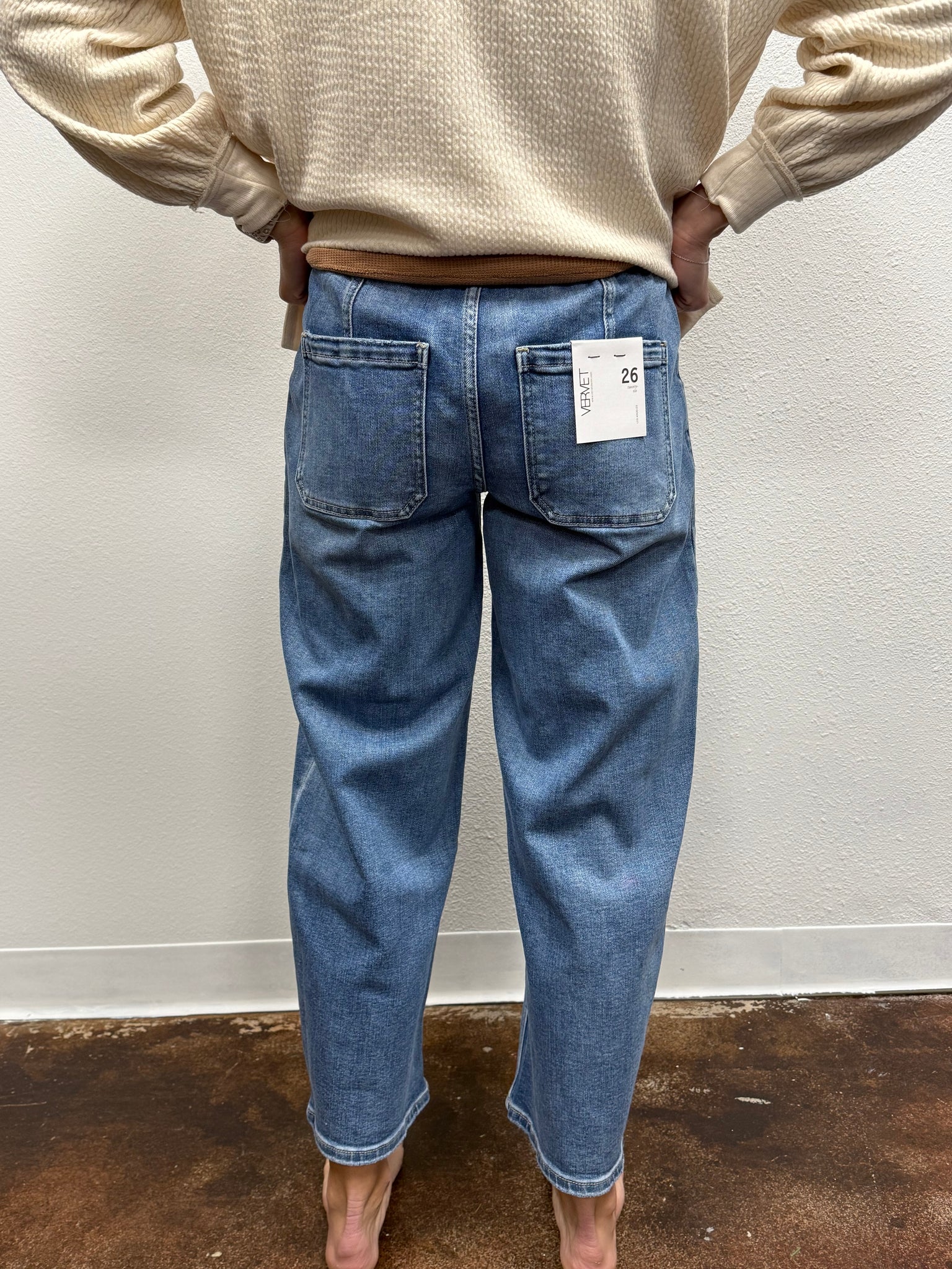 These comfort stretch, high-rise barrel jeans feature an elastic waistband for all-day ease and a modern wide barrel leg. The medium wash and cropped length make them easy to style year-round—cute with sneakers, booties, or sandals.