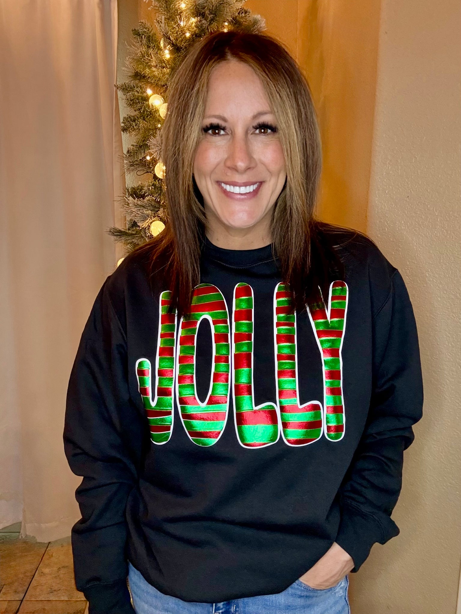 Oh, by golly have a holly, jolly Christmas and you will love these precious color combinations! Jolly in red and green metallic puff on a black sweatshirt! Sara is in a small.