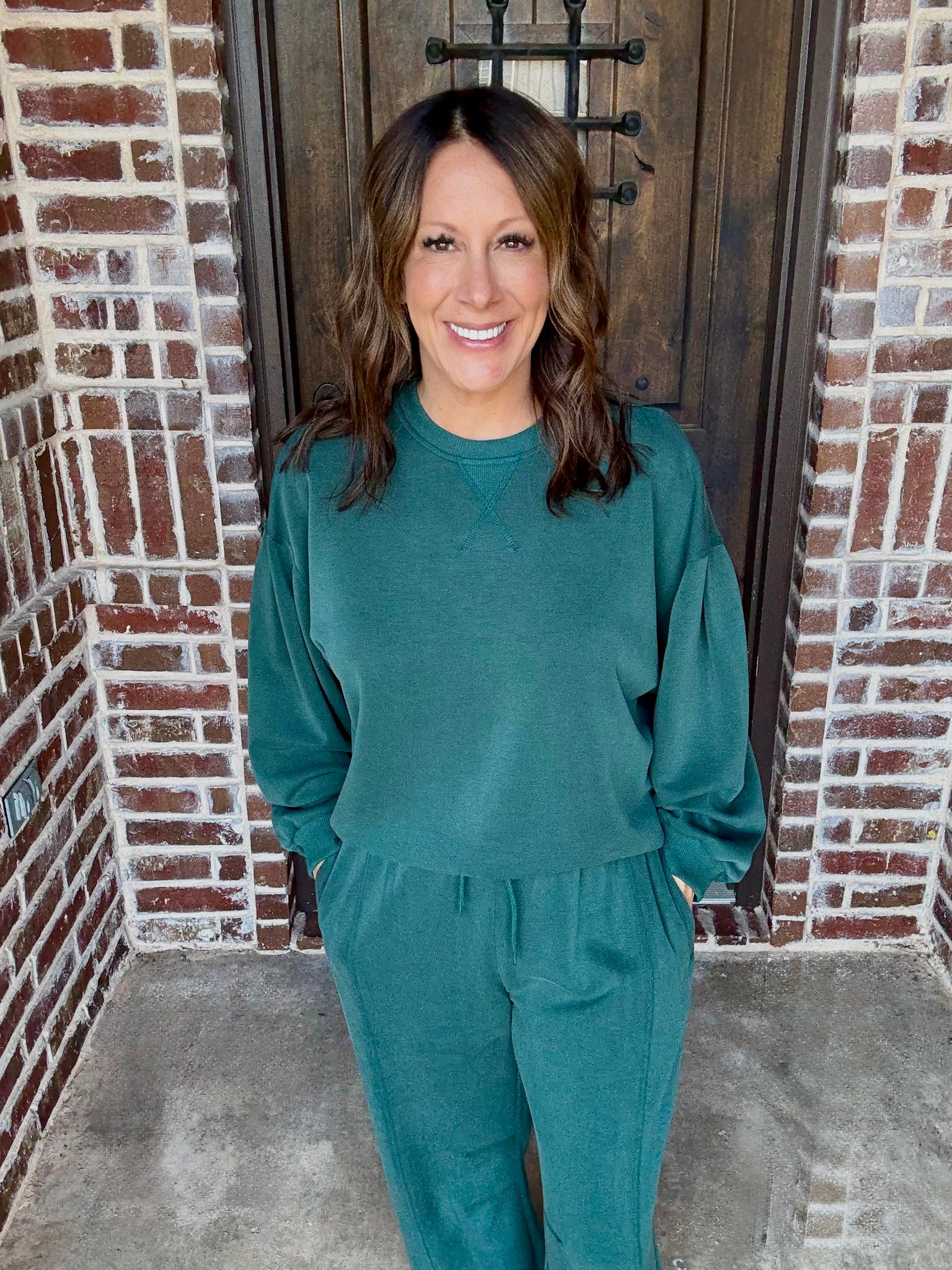 Elevate your everyday look with this pleated pullover sweatshirt, featuring gathered puff sleeves for a soft, feminine touch. The deep teal color adds a rich, stylish tone. Lightweight and unlined for all-day comfort.