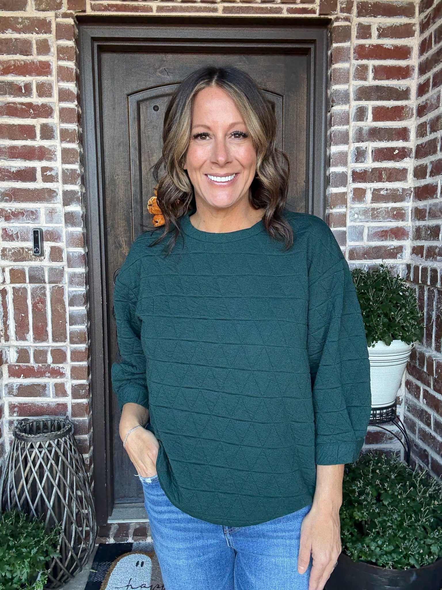 Chic and comfy with a textured finish, drop shoulders, and shirred sleeves accented with buttons. The perfect throw-on-and-go piece with a relaxed fit and round neckline. 97% Polyester, 3% Spandex.